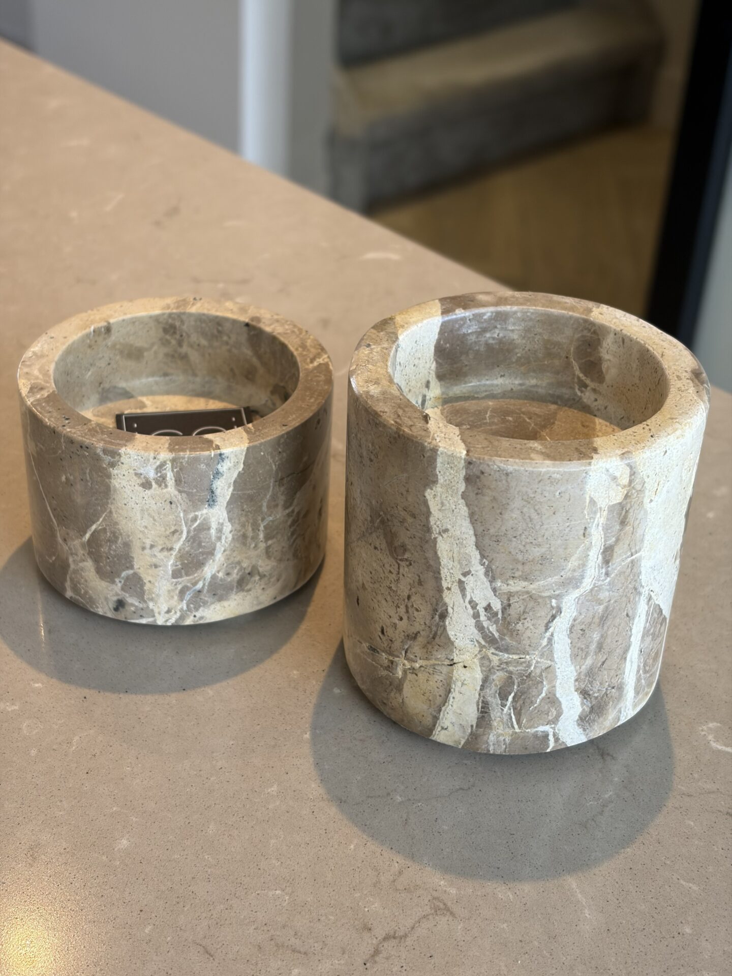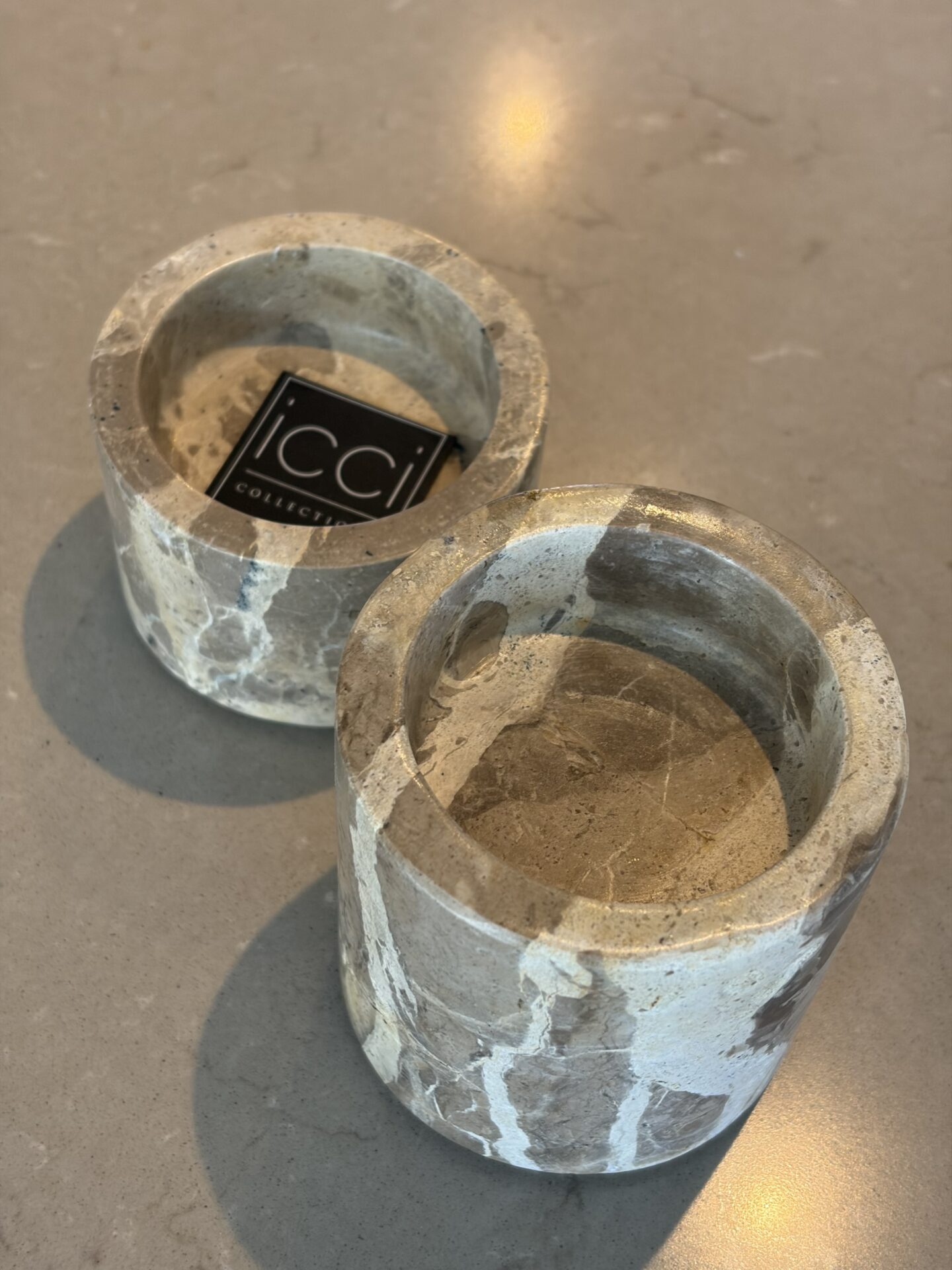 De waxinelichthouders zijn van marmer, dus elke waxinelichthouder heeft weer zijn eigen vorm in marmer.
