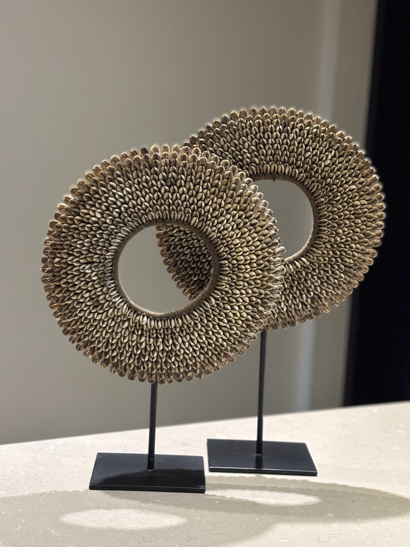 Handgemaakte decoratie van schelpen, waarmee jij je woon- of slaapkamer helemaal in stijl brengt. De kraag is inclusief standaard. Leuk om te combineren met meerdere schelpenkragen bij elkaar.