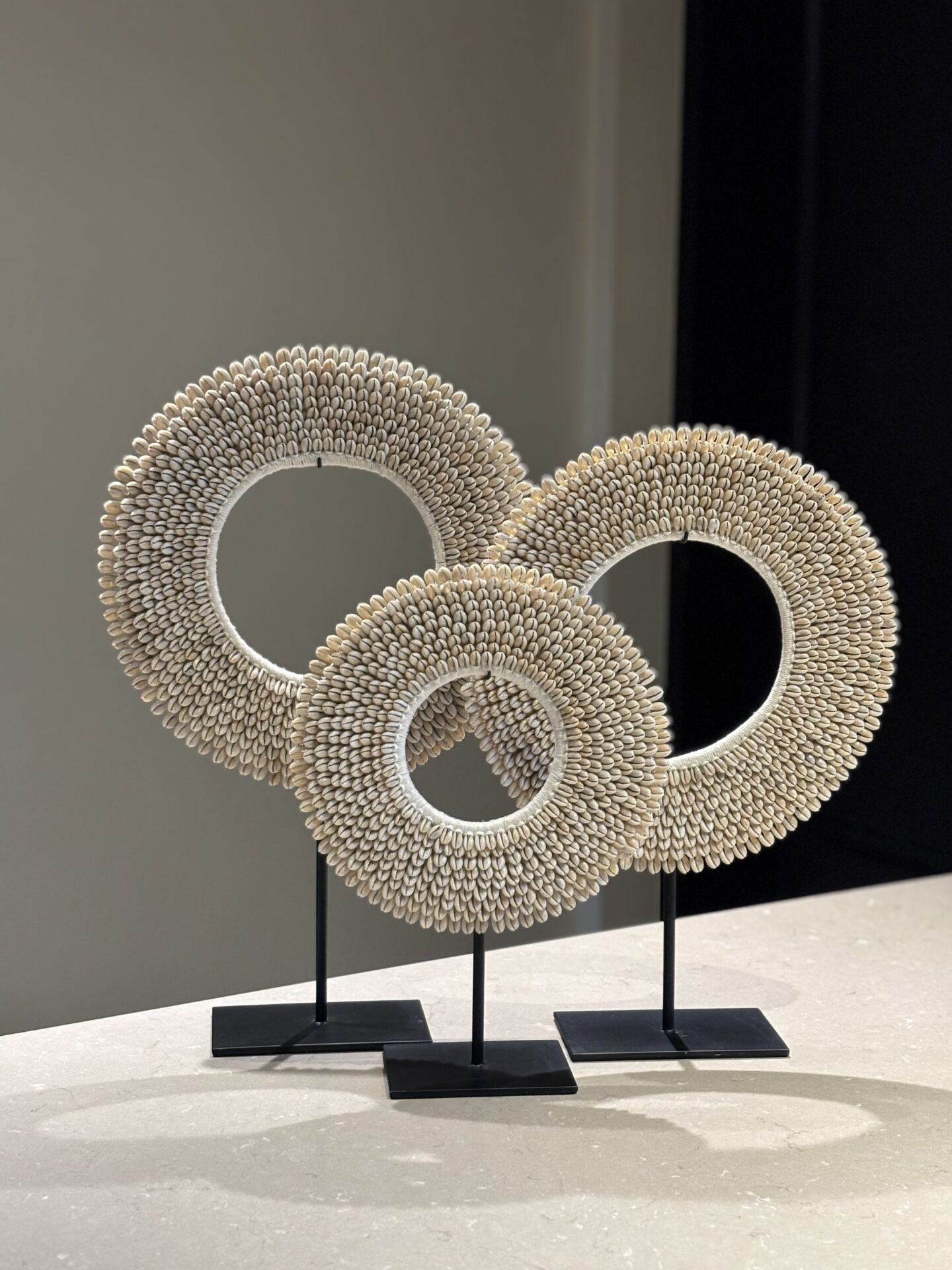 Een prachtige kraag, handgemaakt van schelpen, waarmee jij je woon- of slaapkamer helemaal in stijl brengt. De kraag is inclusief standaard en in verschillende maten.